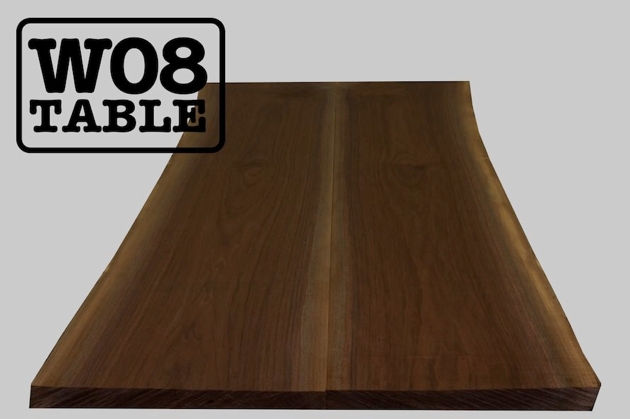 こちらは同じ丸太から採れた2枚の板で製作するW08テーブルです。同じ丸太から採れた複数枚の板は共木と呼んでいます。共木の天板は、色味と木目が揃うというメリットがあります。また、製材した時に上下にあった板をそのまま開いたカタチの天板をブックマッチといいますが、ブックマッチも一種の共木です。写真を見て頂くとわかるかと思いますが、このW08テーブルもブックマッチの天板となります。一箇所、枝が生えていた部分が見てとれます。ですが、この2枚は丸太の中心に近い部分なので穴があくような節ではありません。それ以外の部分はウォールナットらしいキレイな木目が出ています。