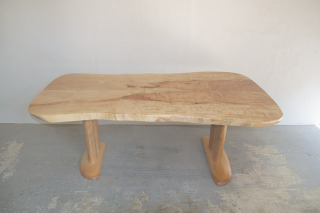 長さが2メートル近くあるトチ材の耳つき2枚はぎテーブルです。基礎コースを終えて応用コースに移って1作目に取り組んだ作品です。根気があればいきなりこんな大作も作れます。テーブルを作りたいというTさんの要望に応えてこちらのトチ材を提案してみたところ気に入って頂けたので採用になりました。本音を言うとこの板でソリウッド製の耳つきテーブルを製作したいなと思っていたのですが……私も気に入っていた板なのです。