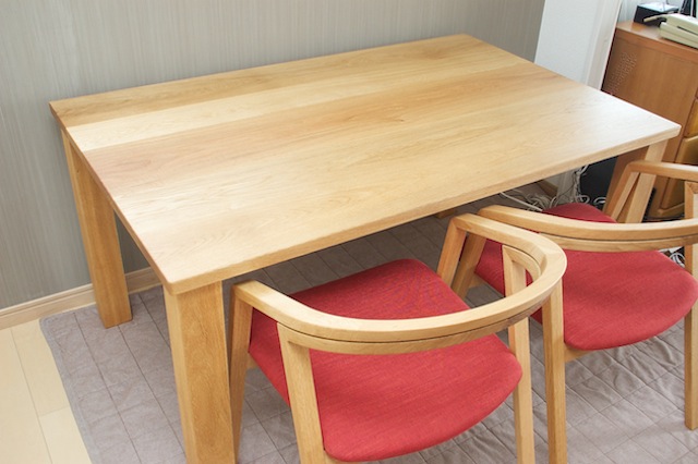 ソリウッドのストレートカットテーブルとISU-WORKSの椅子を合わせて納品した事例です。ともにオイル仕上げです。ソリウッドのテーブルに使用しているオイルとISU-WORKSの椅子に使われているオイルはメーカーは違うものです。でも、仕上がり具合に大差はありません。実際に並べてみてもオイルの違いは分かりません。