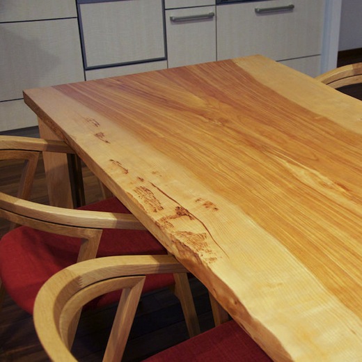 先ほどのローテーブルと色味があっています。実はこの2つのテーブル、同じ丸太から採れた板で製作しています。人間的に考えると兄弟の板で製作したテーブルといえるでしょう。