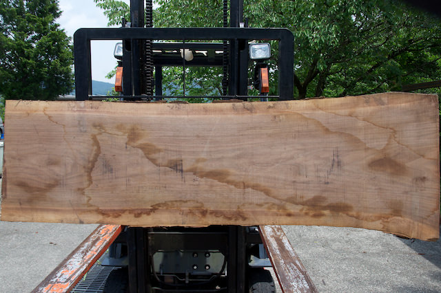 だいたい同じ大きさの板です。こういった耳つきの板は、板の幅で値段が変わってきます。当然ですが、幅の広い板の方が高くなります。丸太の値段も直径でだいたいの値段が決まります。幅が広い板を採るには、太い丸太が必要になります。中身の見えない丸太で、中の様子を伺うには相当な経験が必要になります。丸太を買い付ける人達は経験によって、丸太を見る眼を養っていきます。太い丸太を購入して、中が節だらけやフケがあったりすると大きな損をする可能性があります。丸太を仕入れるのは博打のような要素が常につきまといます。そういった事もあって、ソリウッドの工房の規模では丸太で仕入れるには相当な覚悟が必要です。よって今は板の状態で仕入れる事が多くなっています。